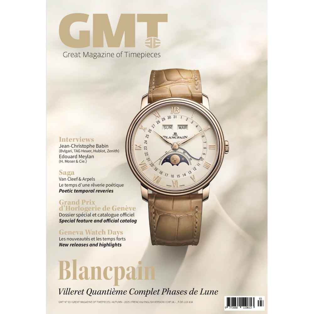 We also look back at the sixth edition of the rapidly growing Geneva Watch Days with two of the co-founders, Jean-Christophe Babin (LVMH watch division) and Edouard Meylan (H. Moser & Cie.), analyzing the event’s current relevance, as well as that of the GPHG and how their brands are doing amid the current economic climate. Among the Maisons that stand out for their expertise and style, Blancpain has given its classic Villeret collection a facelift, earning it the GMT cover; while Van Cleef & Arpels opens the doors to its watchmaking workshops, enabling us to delve into the secrets of its Poetic Complications – a truly dazzling experience! Passion preserves youthfulness and the next quarter-century looks set to be sensational!